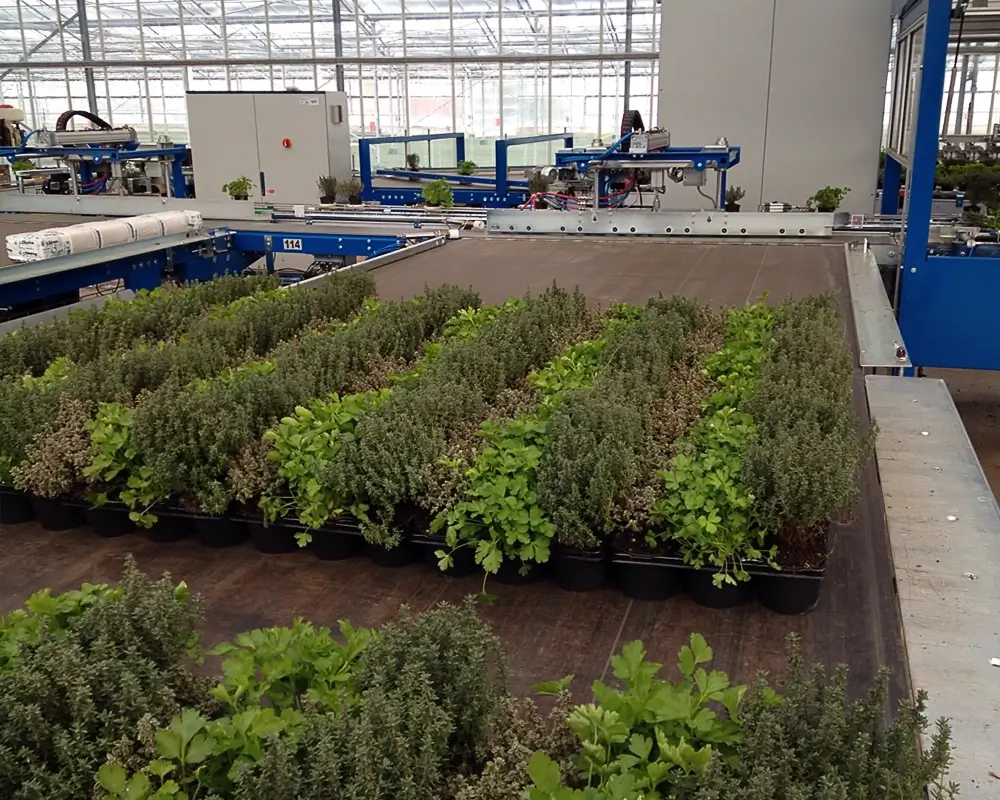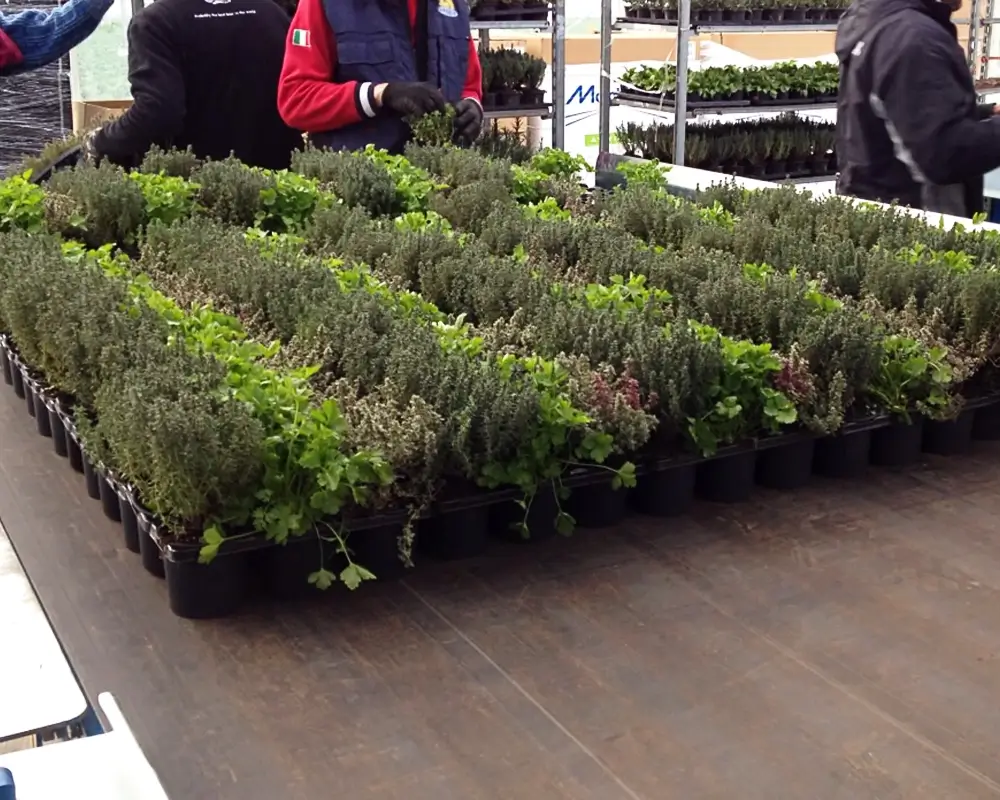 4. Loading up to 6 different types of varieties (thyme, mint, rosemary, marjoram, etc.) in the starting stores to create the desired mix in the pot holders, which are then used for shipment to gardens or GDO.