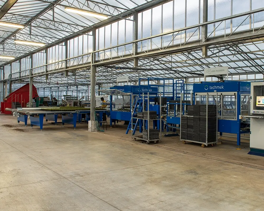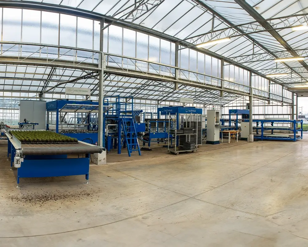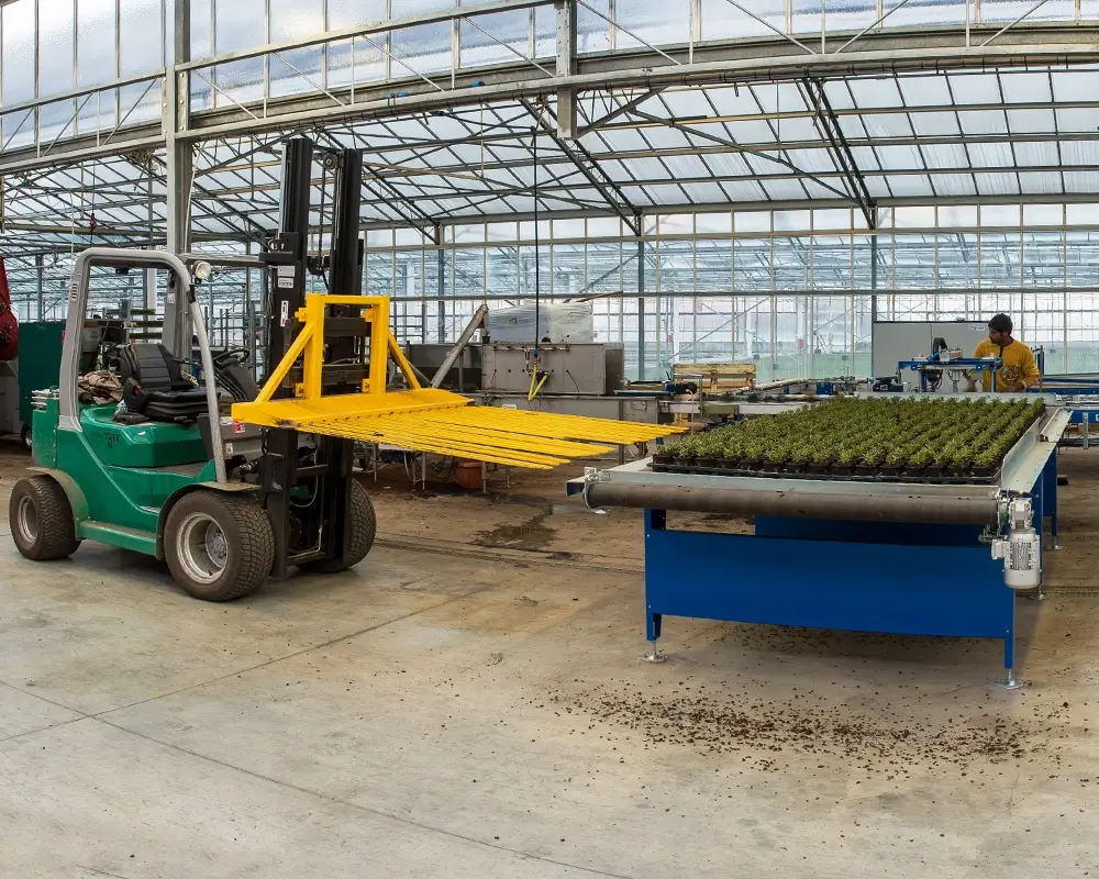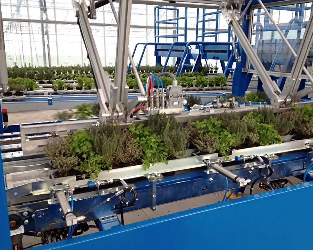 Automated line for processing pot plants 9-10-12. With this line, the following work can be performed on plants that are loaded onto Buffer Belts by means of forklifts with forks. The plants are contained in suitable tray systems (PortaVaso). The plants are picked up from the loading warehouse, transported to the processing area, removed from the pot holders and loaded onto suitable pot holders that rotate through the planting area in the various processing zones.
