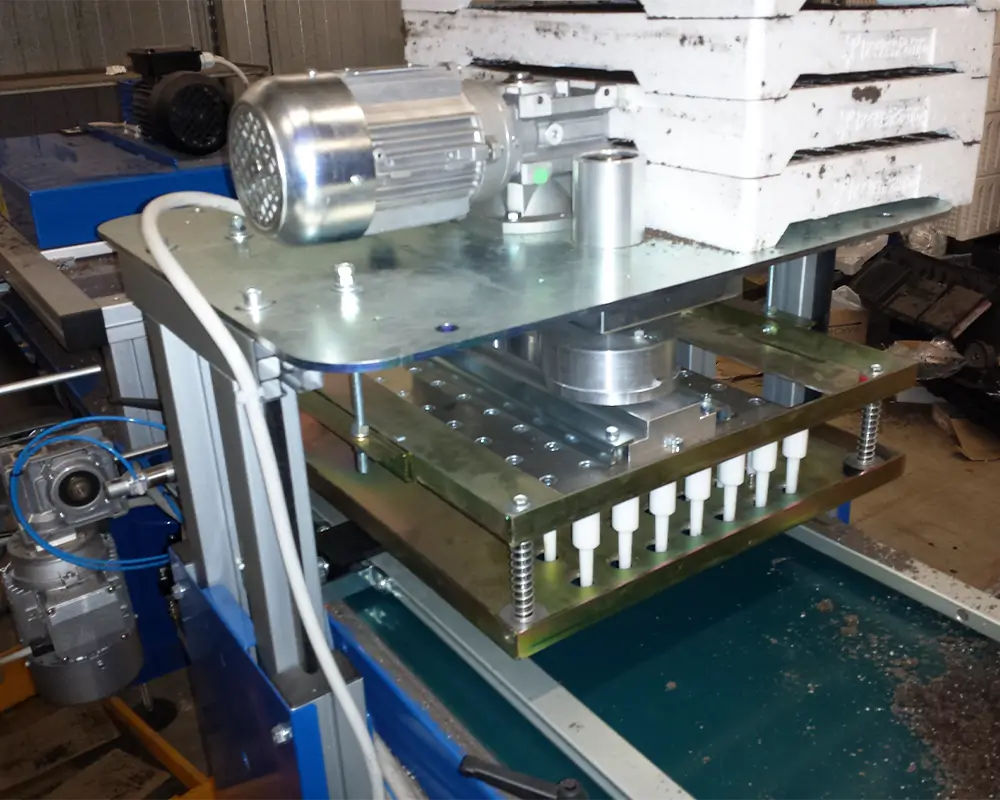 Dibbler is an automated accessory designed to optimise the soil preparation phase in polystyrene seed trays. The trays, already filled with compost, are moved along a motorised conveyor belt beneath a rectangular plate equipped with rotating plastic dibbling tips.