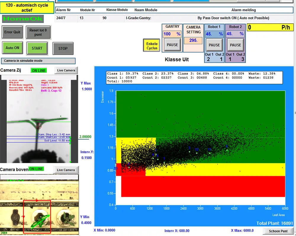 The machine can produce between 6000 and 9500 plants per hour, in up to 4 classes and depending on the size of the plants (waste is automatically placed in a bin).